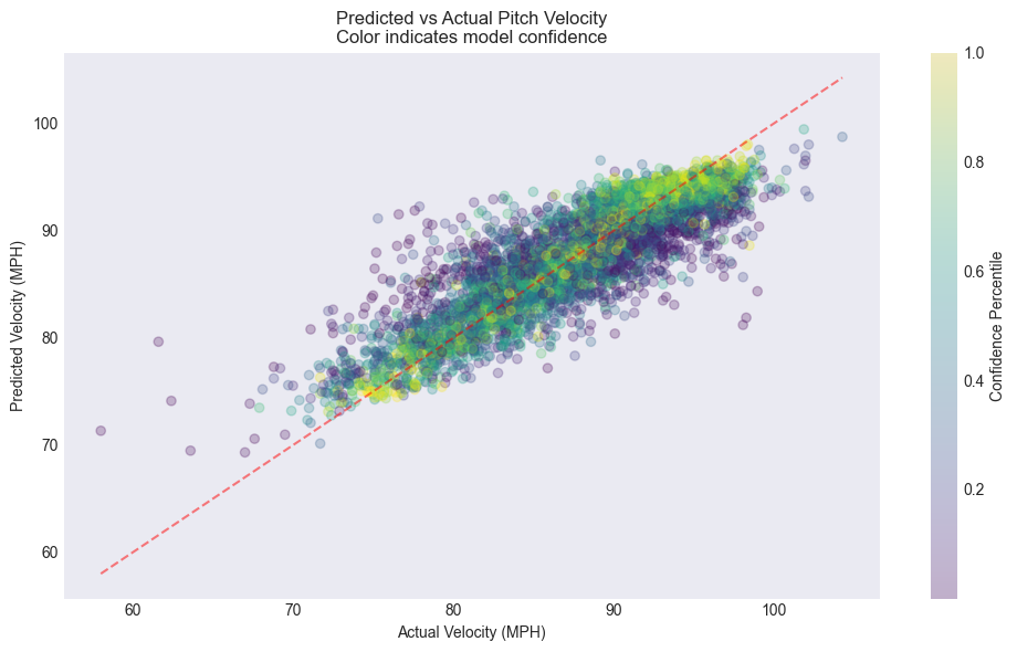 There are no exercises to conclude this chapter, so this was a clear option. An awesome feature of the RandomForestClassifier model is its inbuilt confidence metrics. I wanted to build a model for pitch velocity based on the many available factors I had—pitch location, spin rate and direction, game situation—and understand the confidence of each prediction and the model as a whole. However, the Regressor model has no analogous confidence metric, so I turned to Claude for some help.