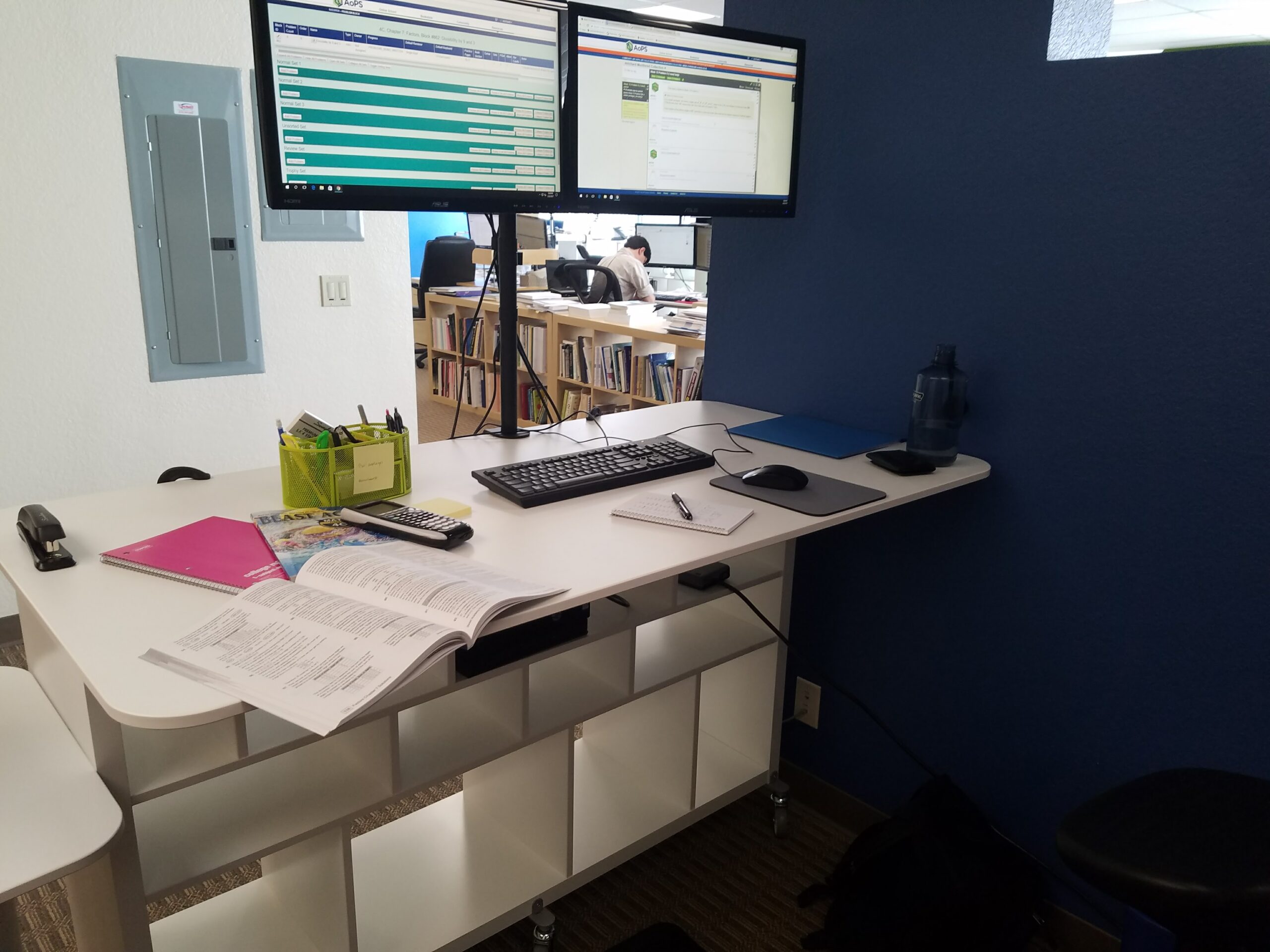 When I arrived, my new coworkers for the summer told me it was good that I was “tall” since they had guessed at the monitor height. As it happened, the monitor height was great, but the desk height was abysmal. I was never brave enough to ask for a lifted keyboard tray, but when I eventually started my full-time position and moved 20 feet from this location to a new desk, I used a tray for my laptop and a stack of books for my mouse pad.