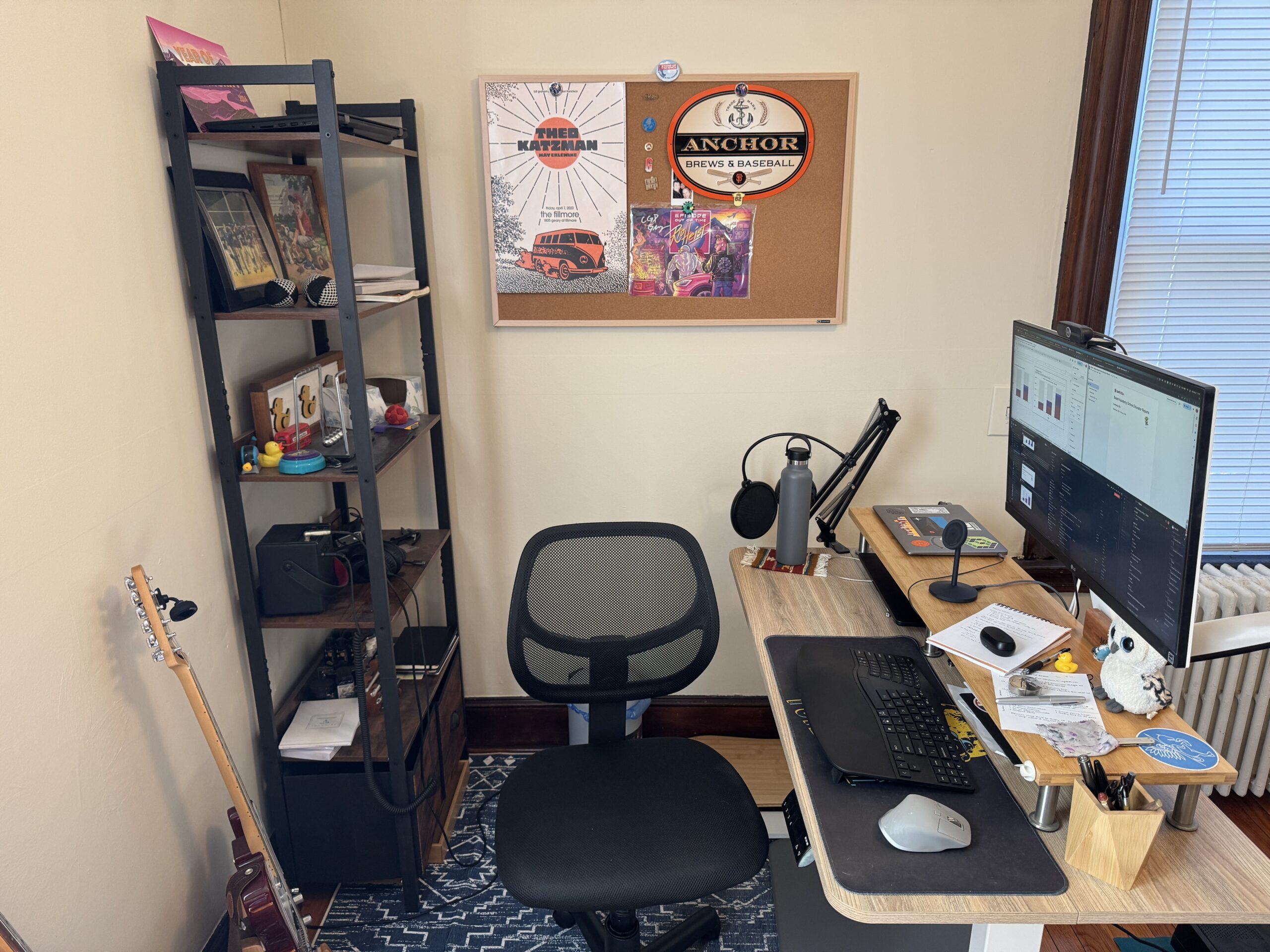 For the first few months living together, I used my setup from San Diego and Erin had a sit/stand desk in the living room. Once she mainly went back to working in the office, I adopted this desk as my own and shifted its location in the bedroom. I had a three-panel room divider behind me for meetings, and it was always a bit cramped and dusty beneath. This picture is my desk at its messiest—normally, my laptop would be on the riser, and if I weren’t journaling, that notebook would be neatly tucked elsewhere. It was cramped at times, but I don’t have a better image available. Its best feature was proximity to an ethernet point for fast and stable internet.
