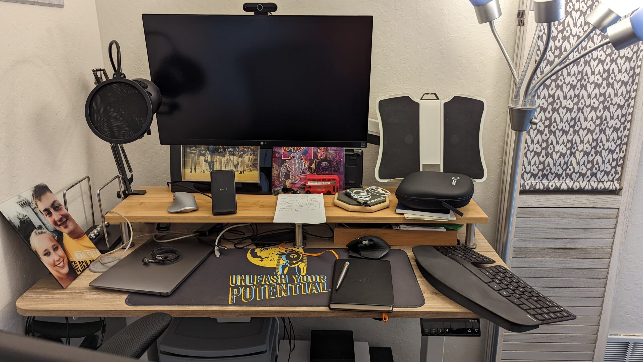 The other part of the VESA mount is unseen to the right, and it has a laptop stand that hovers in front of a walking treadmill. Farther to the right is another small shelving unit with a printer, a speaker, postage, and notebooks ready for use. Where I’m standing as I take this picture is open space that’s good for a yoga mat. This room has proven quite multifunctional, but I’m mainly happy I have a comfortable spot where I enjoy working each day.