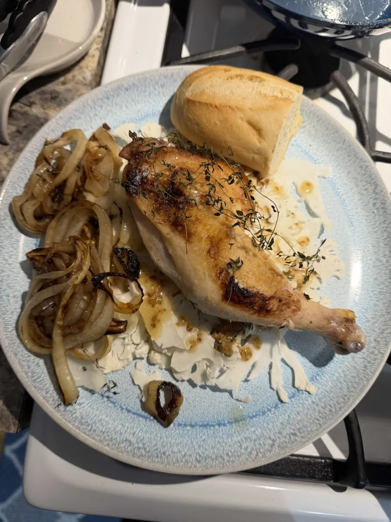 - Bone-in, skin-on chicken legs and onions, cooked in a pan for a bit skin-down to crisp it up, then baked in the oven with red wine vinegar and thyme.
