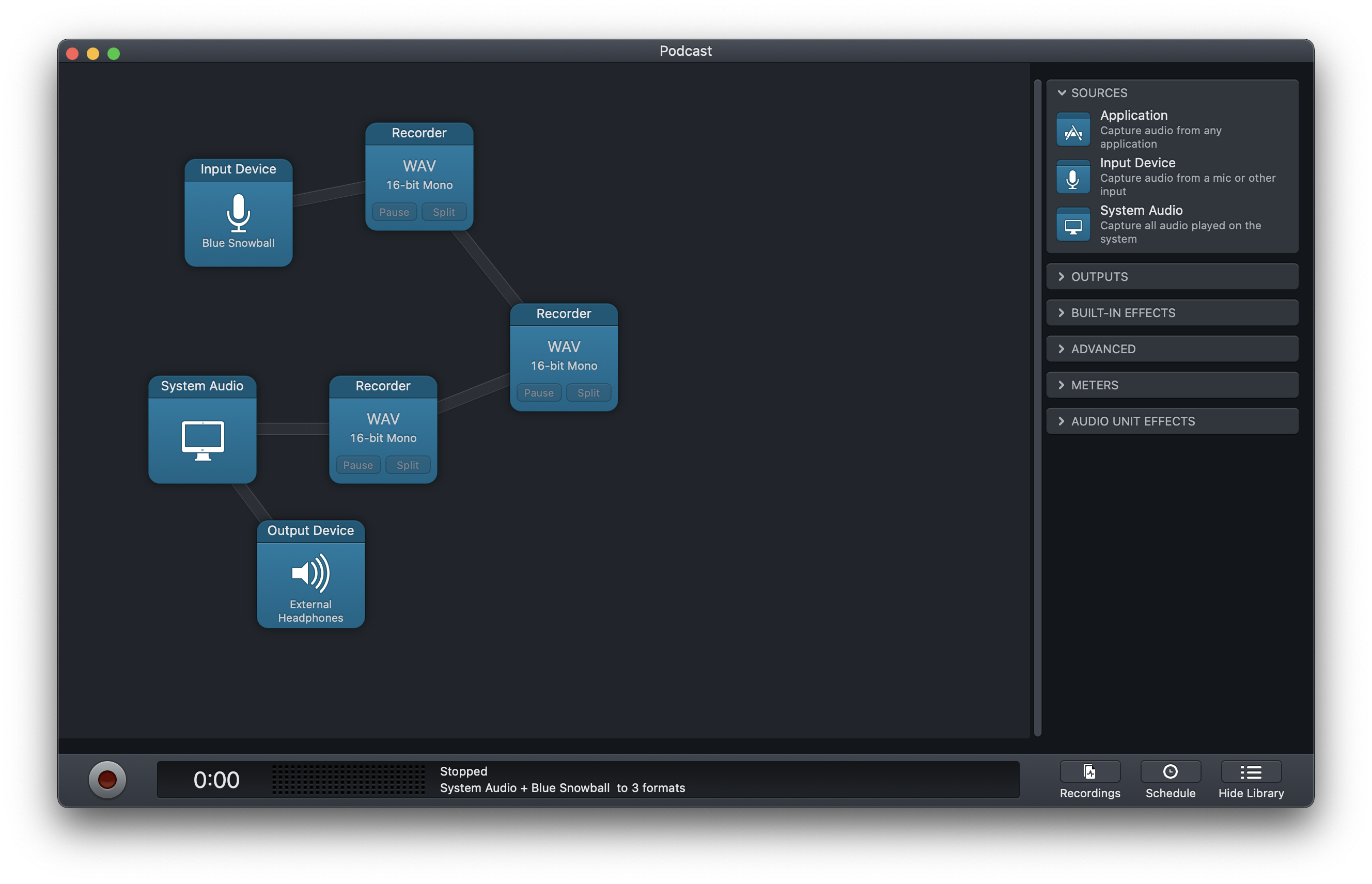 A majority of my podcast listening is taken up by technology-focused shows, and they have a tendency to discuss how they record as part of the show. As such, I was familiar with a few. The standout was always Audio Hijack by Rogue Amoeba. This tool allows you to record any number of devices from any number of inputs to any number of tracks. For my setup, that means a single program lets me record my microphone to a single track, my cohosts on Skype to a separate track (for a rough backup), and a third track that combines the first two as a way to synchronize our voices.