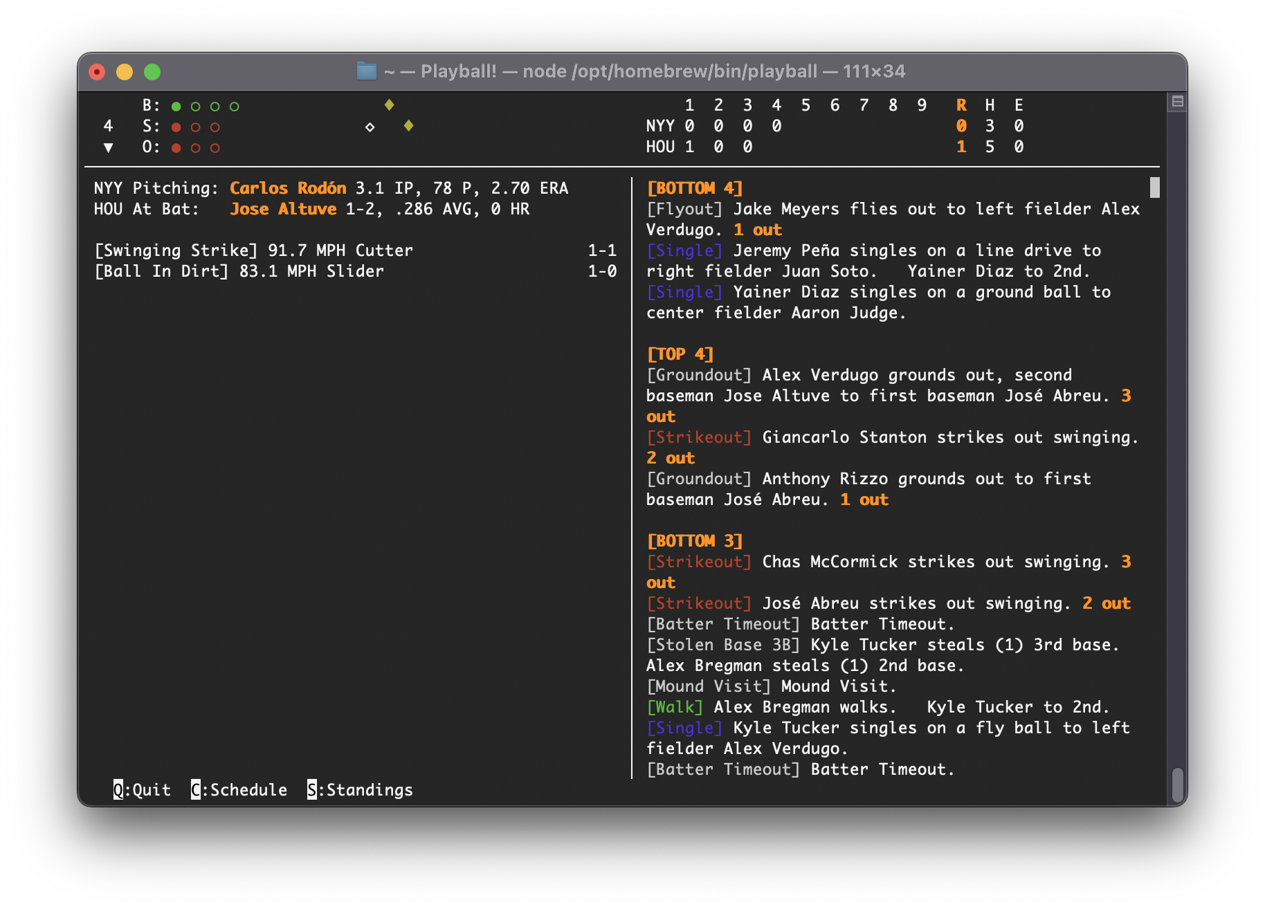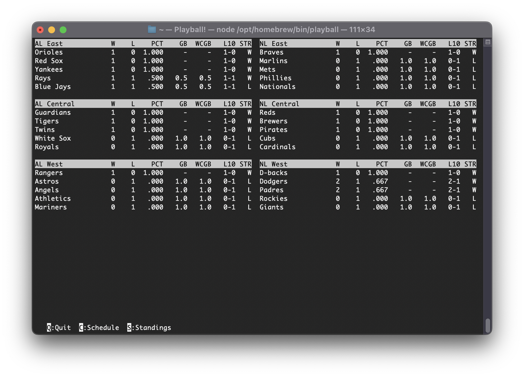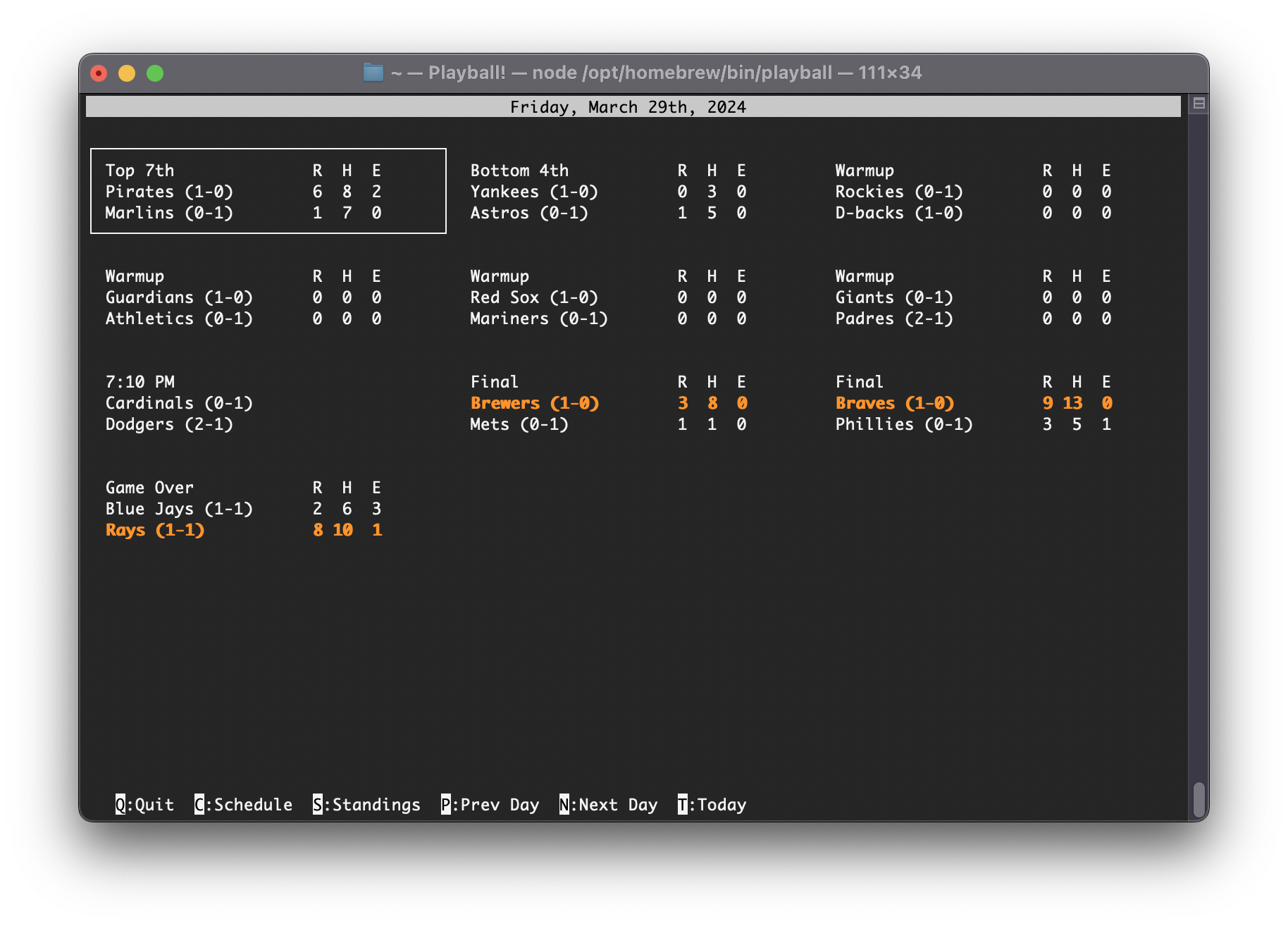 I came across the javascript terminal app Playball. It’s fun and slick, and I’m enjoying using it. It gives you a way to view MLB Gameday data from the terminal, and it’s beautifully done.