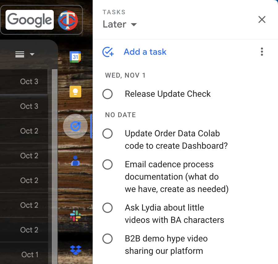 Then we switched to using Front to manage our team email. It took me a day or two before I understood how this took away the easy access to Google Tasks, leaving me without a reliable task management system for daily work. Whoops.