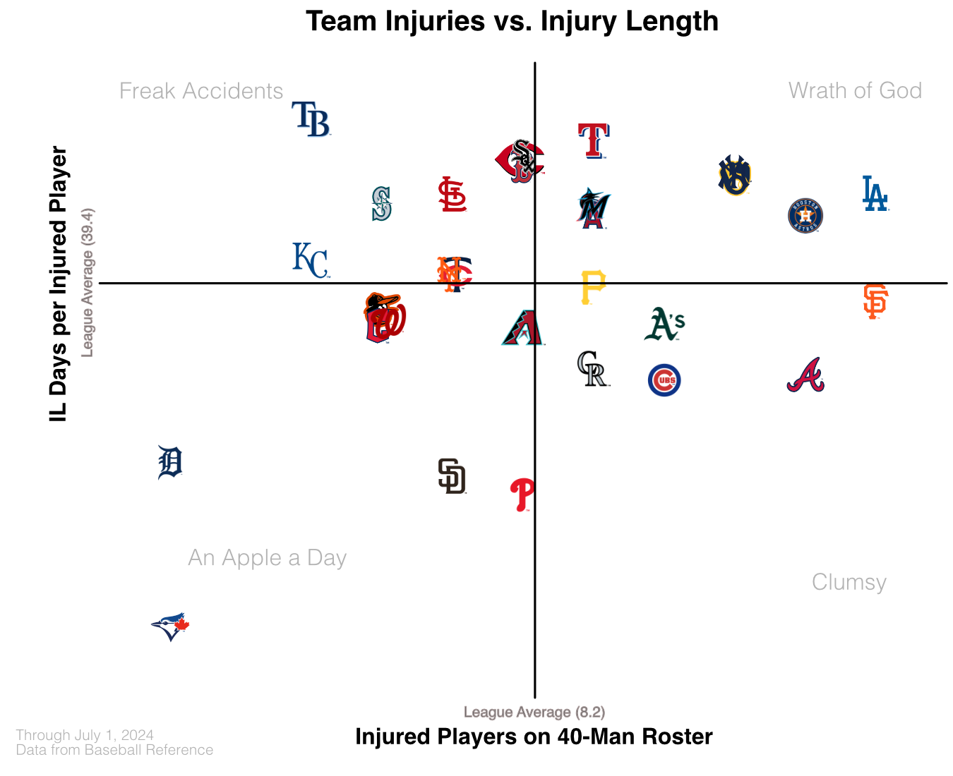 A long, unimportant1 train of thought and research led me to notice the Brewers seem to have quite a few injured players. That led me to make this chart comparing how many players on each team were listed as injured, and the average length of time they are listed for. Note that in MLB, the injured list is divided into chunks like 10, 15, 45, and 60 days. A player on the 60-day injured list is removed from the 40-man roster, so using the designated injured list is only a rough proxy for injury severity. Some players on the 60-day injured list will be out for an entire season, while others half a season. Technically the team hasn’t “lost” that player on the roster, but they may be a key piece of the team that isn’t available.