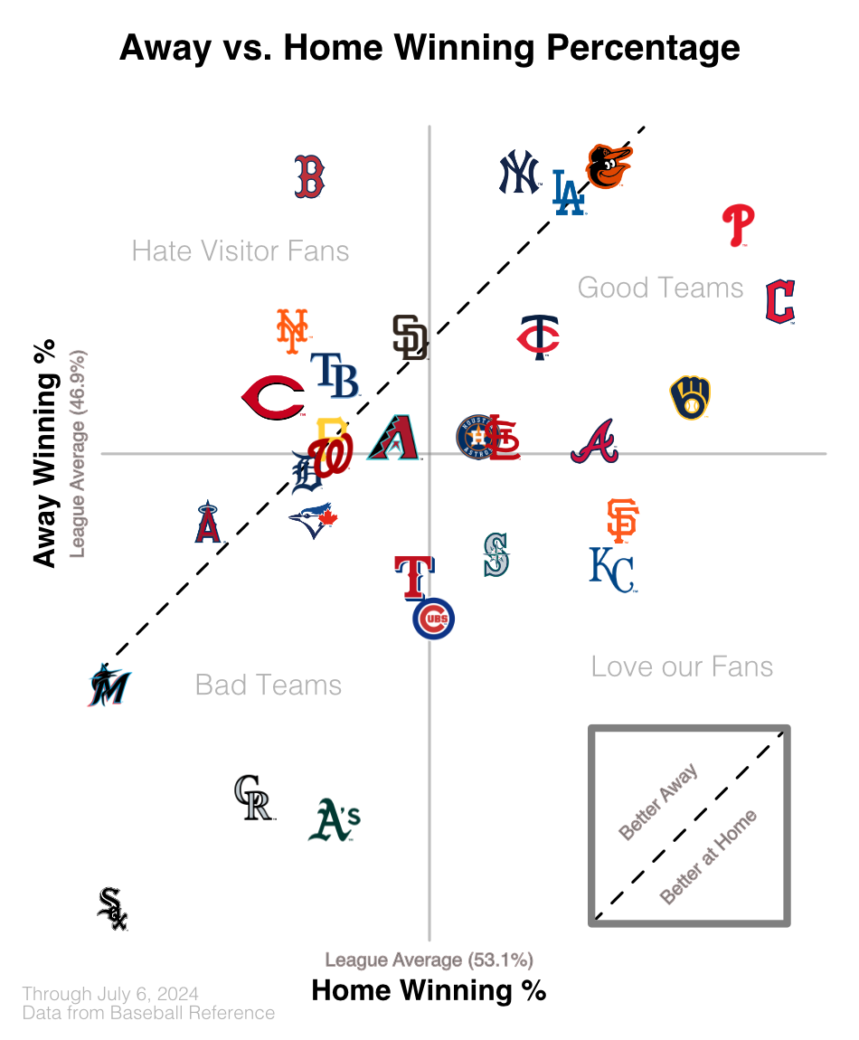 This chart shows that most teams, 23 by my count, win at least as much at home as they do on the road. Only the Red Sox are so egregiously against this trend that you have to wonder if their roster is constructed in a way that is thoroughly not optimized for Fenway Park. The other six teams that win more on the road are not too far off the trend.