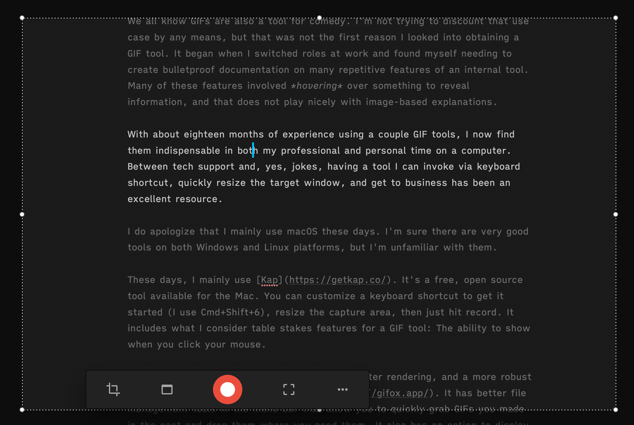 These days, I mainly use Kap. It’s a free, open source tool available for the Mac. You can customize a keyboard shortcut to get it started (I use Cmd+Shift+6), resize the capture area, then just hit record. It includes what I consider table stakes features for a GIF tool: The ability to show when you click your mouse.
